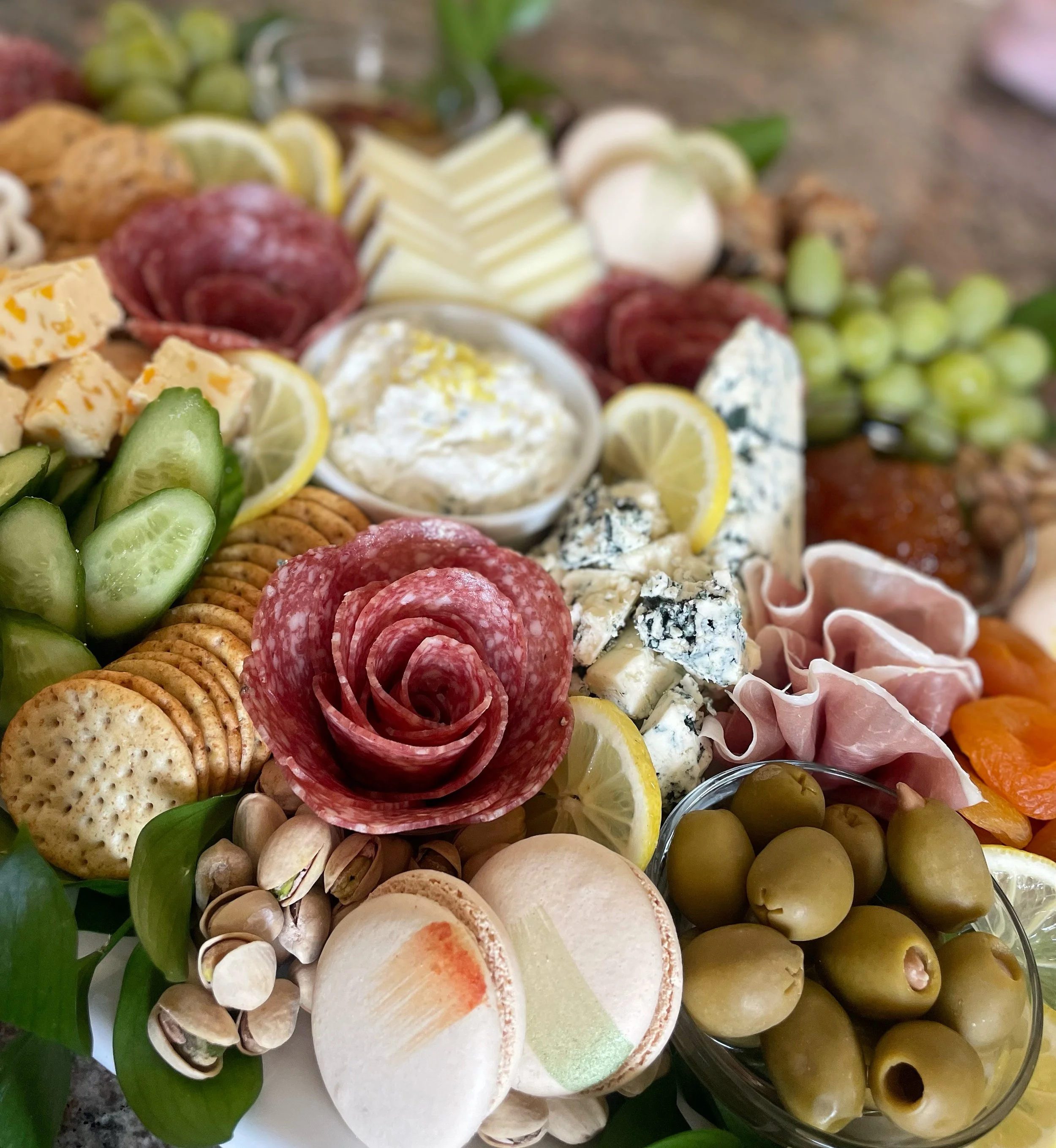 Includes artisan cheeses, charcuterie meats, fresh/dried fruits and accoutrements such as assorted crackers, olives, nuts, cornichons, jams, honeys, vegetables and our crafted gourmet spreads.